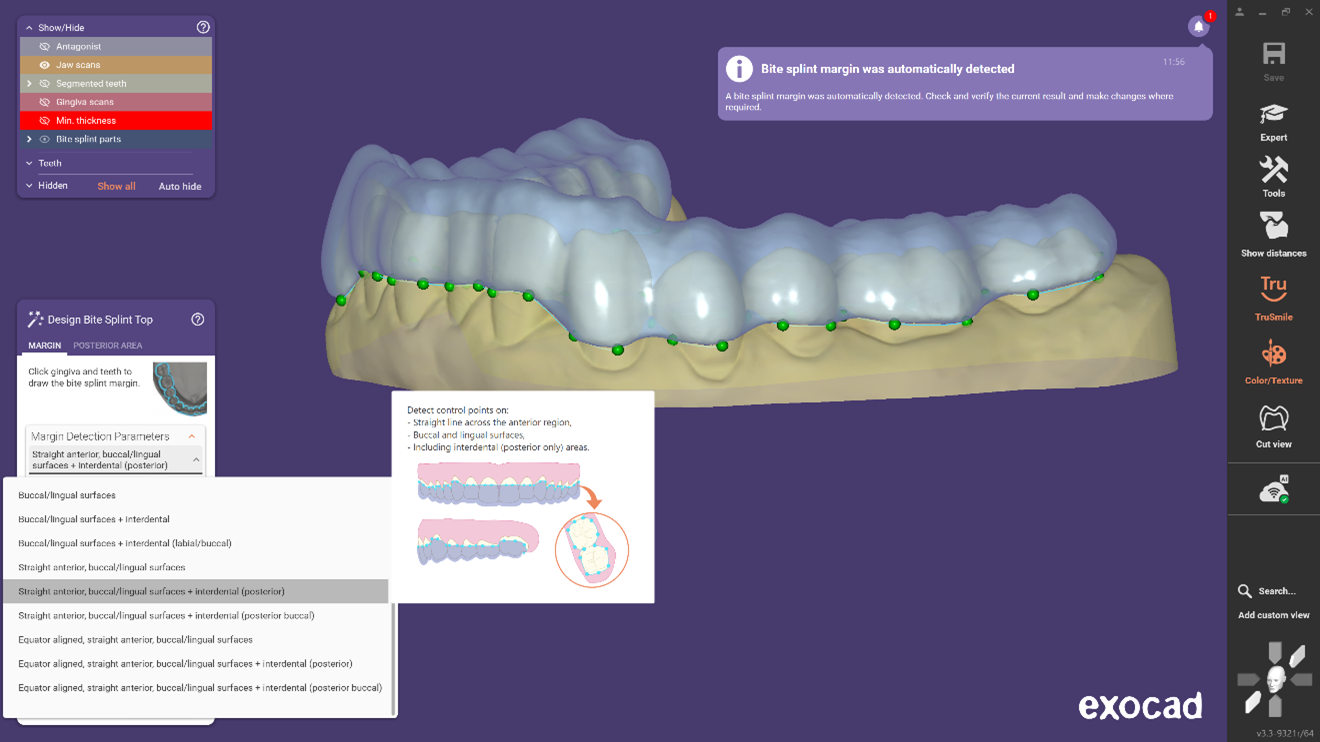Tervezzen harapásvédőket. Gyorsan, mindössze néhány lépésben tervezhet kiváló minőségű terápiás harapásvédőket. A könnyen testre szabható eszközöknek és az intuitív munkafolyamatnak köszönhetően, amely végigvezeti a tervezési folyamaton, a harapássínek gyártása hatékony és jövedelmező. A kiegészítő modul kiterjedt funkcionalitása lehetővé teszi az okklúzió virtuális beállítását és a nemkívánatos interferenciák eltávolítását. Az éjszakai védők felületét egyenként simíthatja és formázhatja, vagy kiválaszthatja a hátsó okklúziós felszín automatikus simításának opcióját. Növelje a páciensek elégedettségét és a terv márkaazonosságát logója és szövege hozzáadásával. Az optimális eredmény elérése érdekében a harapásrögzítő és a virtuális artikulátor kombinációját javasoljuk. Azonnali fogászati megoldásokat biztosíthat pácienseinek az exocad nyitott rendszerének használatával – készítsen egyedi tervezésű terápiás éjszakai védőket közvetlenül bármilyen kompatibilis, nyitott marógépen vagy 3D nyomtatón.